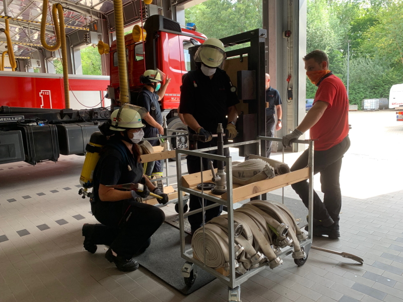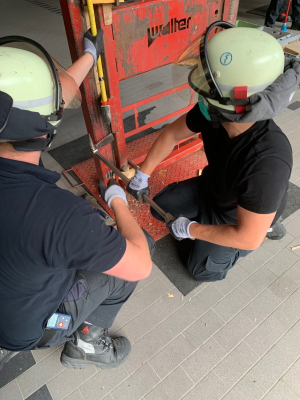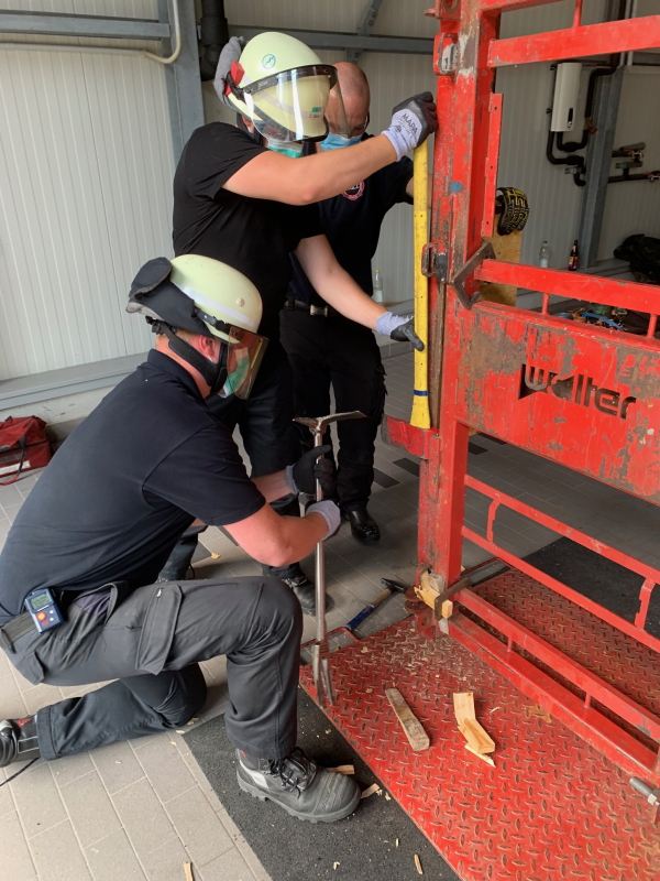 In zwei Gruppen, je eine am Vor- und am Nachmittag wurde die Schulung unter Beachtung der bestehenden Corona Hygieneregeln, in der Fahrzeughalle durchgeführt. Hierbei wurde der Umgang mit dem Tool erklärt und gleich in der Praxis beübt. Truppweise wurden mittels Tool und Feuerwehraxt an zwei Türen verschiedene Techniken angewandt, nachdem auch Möglichkeiten beim Einsatz an PKW gezeigt wurden. Eine Tür wurde dabei rechts und links zugestellt, sodass es wie in natura in beengter Form realistischer wurde. Dem nicht genug ging der Trupp unter Tragen eines Atemschutzgerätes vor. Zum Schluss wurde von den Ausbildern ein Wettkampf angesagt. Es galt, welcher Trupp die Türe am schnellsten öffnen konnte. Die Bestzeit lag bei unter 17 Sekunden. Nicht zuletzt wurde mehrmals auf die Verhältnismäßigkeit hingewiesen. Es wird weiterhin zunächst der zerstörungsfreie Weg gewählt, sofern es die Zeit erlaubt. Alle Teilnehmer waren trotz der großen Hitze sehr engagiert und nahmen einiges an Wissen mit. Es war eine sehr lehrreiche und interessante Schulung.