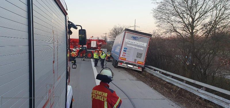Die Abt. Ettlingen-Stadt wurde auf die Bundesautobahn 5 in Fahrtrichtung Basel zu auslaufendem Kraftstoff aus einem LKW gerufen. Vor Ort konnte kein auslaufender Kraftstoff festgestellt werden, stattdessen ein gasbetriebener Sattelzug, welcher kurz nach der Anschlussstelle Karlsruhe Süd von der Fahrbahn abkam und daraufhin in die Leitplanke fuhr.