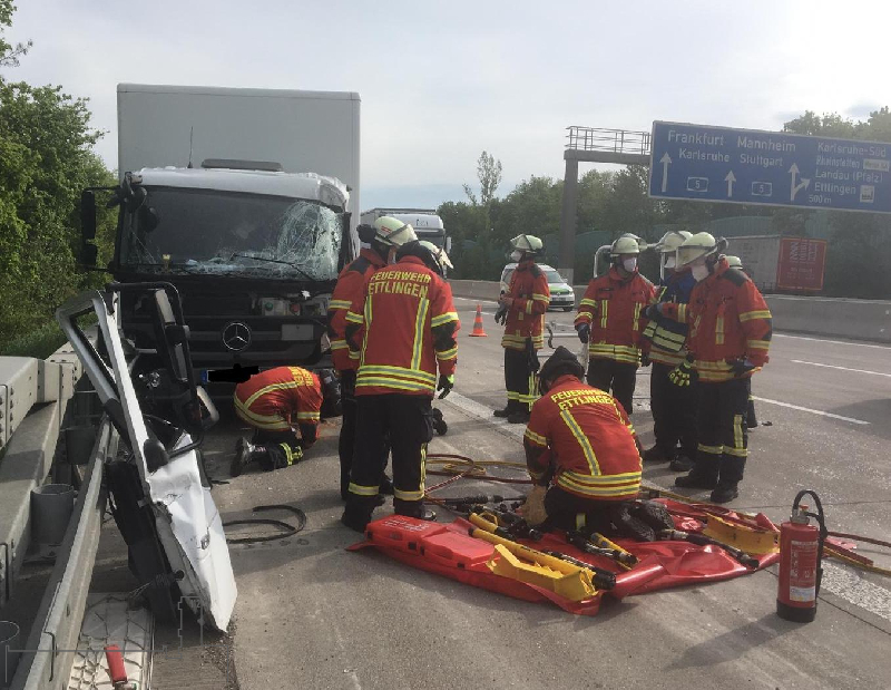 Der Rüstzug der Abteilung Ettlingen wurde erneut zu einem Verkehrsunfall auf der BAB 5 in Fahrtrichtung Basel alarmiert. Ein LKW war auf einen Sattelzug aufgefahren und der Fahrer des LKW war im Beinbereich eingeklemmt.