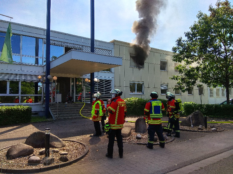 Beim Eintreffen an der Einsatzstelle ergab die Erkundung, dass ein Büro im Vollbrand stand und das Gebäude bereits geräumt wurde. Da die Fensterscheiben des Brandraumes durch die Hitzeentwicklung gesprungen waren, konnte parallel zur Brandbekämpfung ein Lüfter eingesetzt werden. Das Feuer wurde von einem Atemschutztrupp innerhalb von wenigen Minuten gelöscht. Anschließend wurden der Brandraum, die benachbarten Räume, die Außenfassade und das Dach von drei weiteren Trupps unter Atemschutz mit der Wärmebildkamera auf Glutnester kontrolliert und Nachlöscharbeiten durchgeführt. Dabei kam auch die Drehleiter zum Einsatz, um Fassadenelemente zu lösen.
