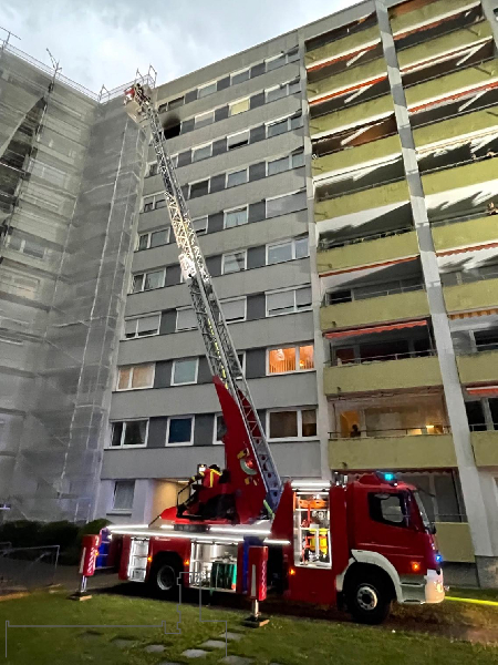 Da in einer Wohnung im Geschoss über der Brandwohnung niemand die Türe öffnete und dort die Heimrauchmelder ausgelöst hatten, wurde diese durch einen weiteren Trupp über die Drehleiter von außen überprüft.