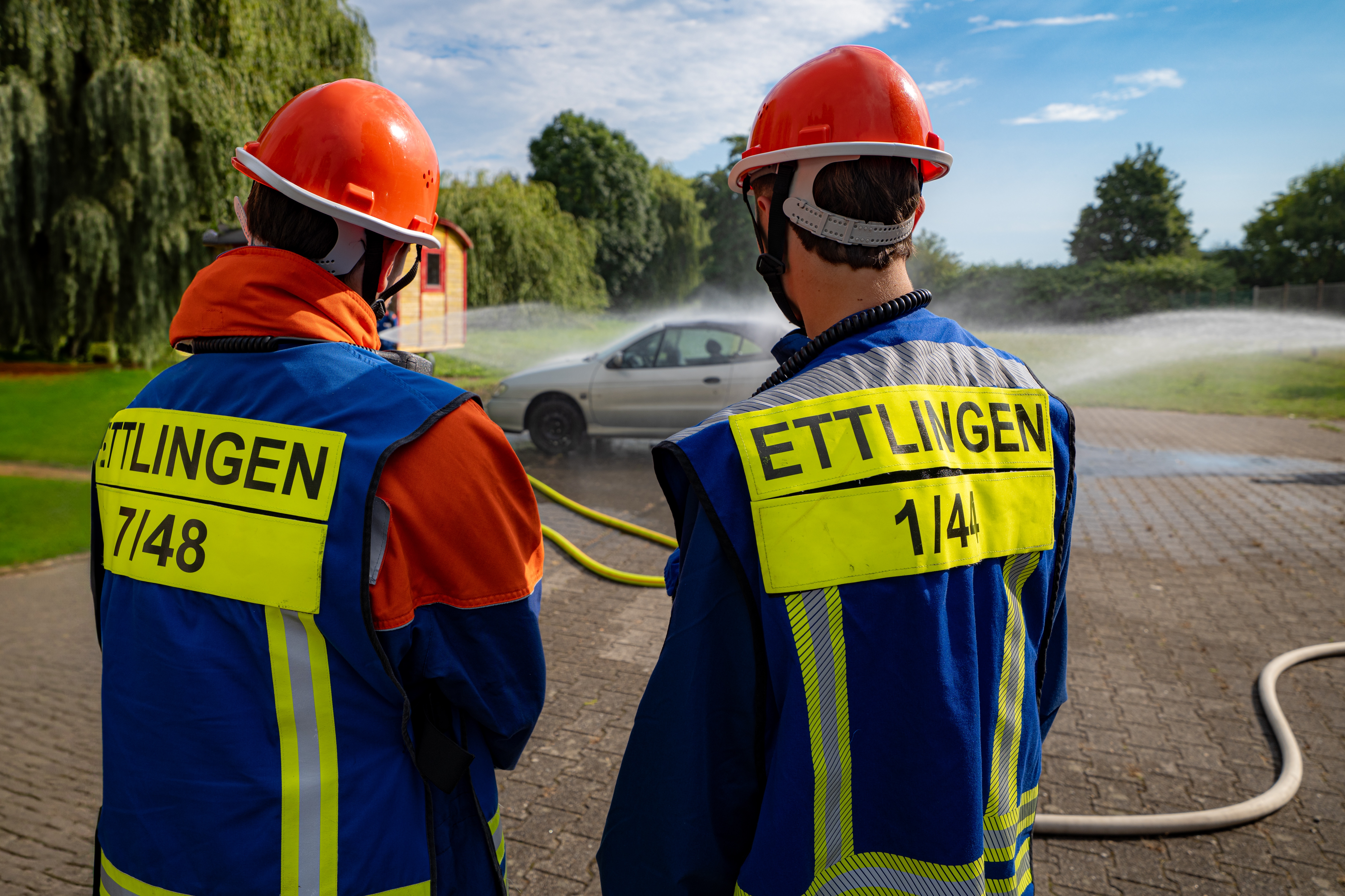 Pünktlich um 8 Uhr begann der Tag im Feuerwehrhaus Ettlingen. Insgesamt 31 Jugendliche der Jugendfeuerwehr und 8 Mitglieder des Jugendrotkreuzes nahmen an der Aktion teil. Nach einer kurzen Begrüßung wurden die Fahrzeuge übernommen und die Einsatzbereitschaft überprüft. Schon um 08:50 Uhr ertönte der erste Alarm: Eine Brandmeldeanlage im Ortsteil Ettlingenweier hatte ausgelöst. Während dieser Einsatz noch lief, wurden weitere Jugendliche zu einer Notfalltüröffnung nach Oberweier sowie zu einem brennenden PKW in Bruchhausen alarmiert. Alle drei Einsätze wurden durch die Jugendlichen souverän abgearbeitet.