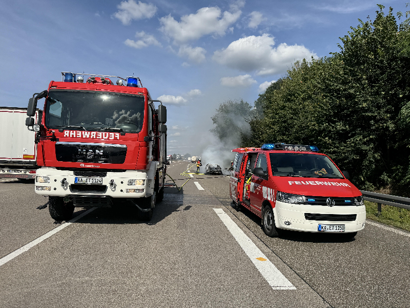 Ein PKW stand auf der Autobahn kurz vor der Anschlussstelle Karlsruhe-Süd in Vollbrand, wodurch ein Bankettbrand verursacht wurde.