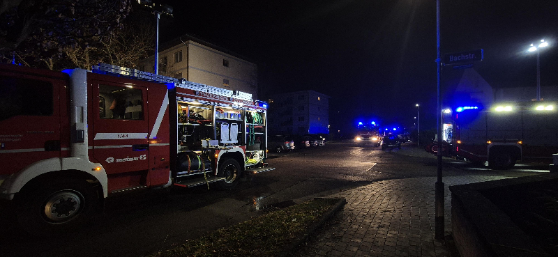 Der Löschzug der Abteilung Ettlingen-Stadt, der Löschzug Tal und der ELW 2 der Feuerwehr Malsch wurden zu einem Brand mit der Meldung „Menschenleben konkret in Gefahr“ in die Schleinkoferstraße alarmiert.