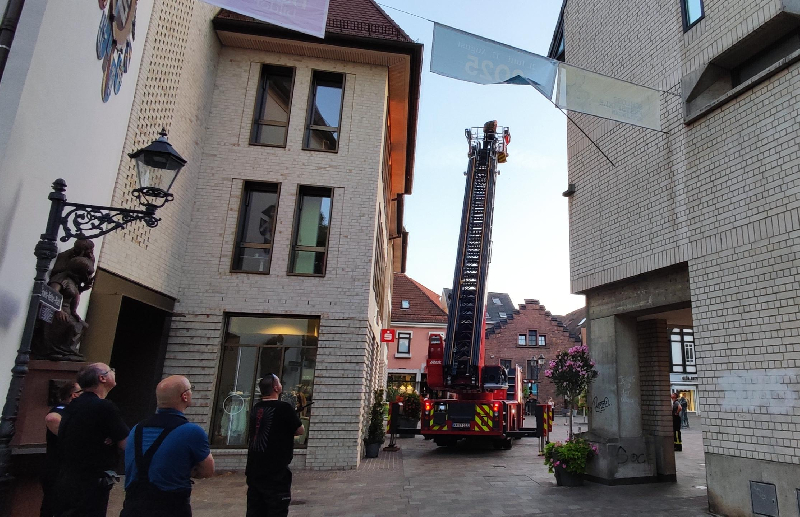 An mehreren Bannern in der Innenstadt drohten Stabilisierungs- bzw. Beschwerungsstäbe abzustürzen. Diese wurden mittels Drehleiter entfernt.