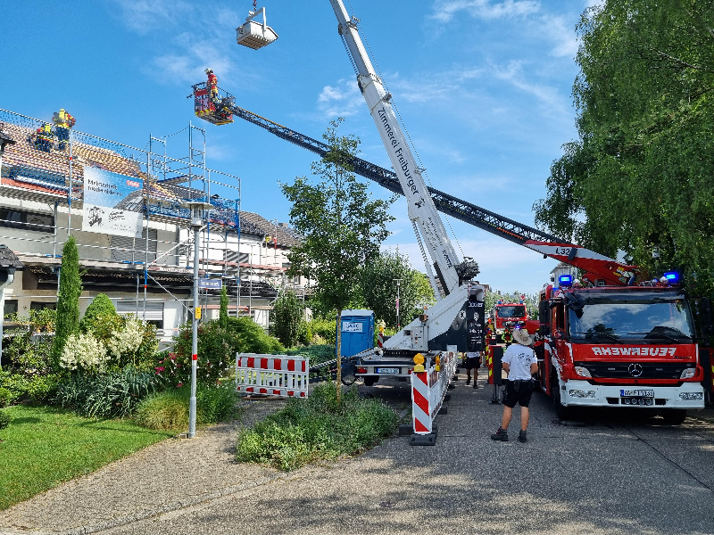Der Löschzug der Abteilung Ettlingen-Stadt wurde mit dem Löschzug Tal und dem ELW 2 der Feuerwehr Malsch zu einem Dachstuhlbrand in Oberweier alarmiert. Beim Eintreffen der Feuerwehr war eine Rauchentwicklung im Bereich des Daches eines Reihenmittelhauses sichtbar. Wegen Baumaßnahmen war das Dach nicht gedeckt und das Gebäude eingerüstet. So konnten die Trupps unter Atemschutz über das Gerüst vorgehen und das brennende Dämmmaterial ablöschen, wozu auch die Drehleiter zum Einsatz kam. Da sich bei dieser Art von Dämmplatten im Inneren Glutnester bilden können, die von Außen nicht erkennbar sind, wurde das Material großflächig entfernt.