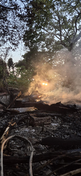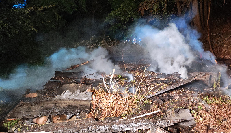 Beim Eintreffen der ersten Fahrzeuge konnte ein Brand etwa 150 Meter oberhalb des Vogelsangwegs im Gewann "Ober Weißer Berg" lokalisiert werden, der sich in alle Richtungen ausbreitete. Mehrere Trupps unter Atemschutz gingen durch das unwegsame und steile Gelände zur Brandbekämpfung vor. Da das Gebäude bereits eingestürzt war und sich unter den Trümmern Glutnester gebildet hatten, waren die Löscharbeiten sehr aufwändig, weshalb Vollalarm für alle Abteilungen ausgelöst wurde. Zur Unterstützung waren Fachberater Bau/Einsturz, Mitarbeiter der Forstverwaltung, das THW und der KFV-Pressesprecher an der Einsatzstelle.