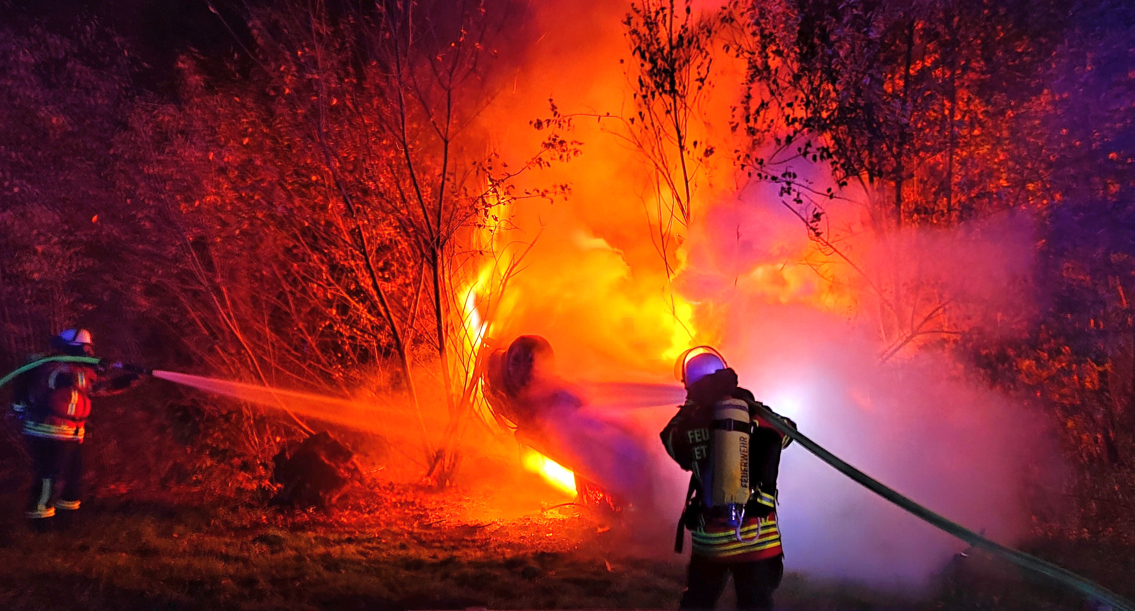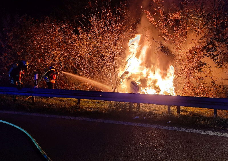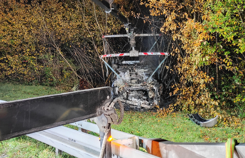 Die Feuerwehr Ettlingen wurde zu einem Fahrzeugbrand auf die Überleitung der L605 von der AS-Süd kommend auf die B3 in Richtung Malsch alarmiert. Ein PKW war über die Leitplanke in ein kleines Waldstück geschleudert und lag beim Eintreffen der Feuerwehr in Vollbrand stehend auf dem Dach. Glücklicherweise hatten sich alle Insassen bereits selbst aus dem PKW befreit. Der Fahrzeug wurde mit zwei C-Rohren abgelöscht. Anschließend wurde Schaummitel eingesetzt um ein Wiederaufflammen zu verhindern.