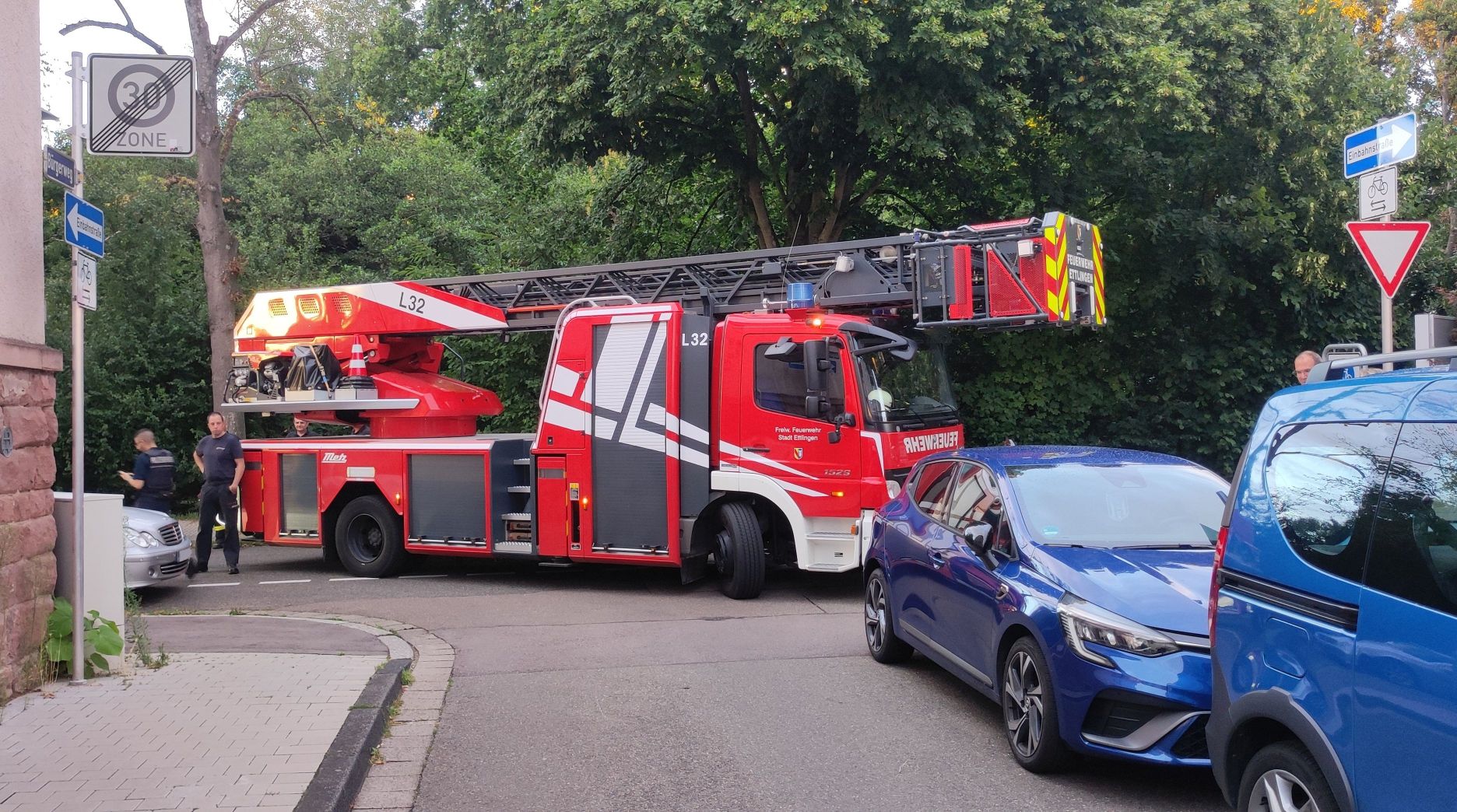 Die Feuerwehr Malsch wurde gemeinsam mit der Drehleiter, dem Abrollbehälter Atemschutz und dem Einsatzführungsdienst der Feuerwehr Ettlingen mit dem Stichwort „B – Kaufhaus / Ladengeschäft“ nach Malsch alarmiert. Da bereits auf der Anfahrt des Notarzteinsatzfahrzeugs eine massive Rauchentwicklung bestätigt werden konnte, wurde das Alarmstichwort auf „Alarmstufenerhöhung B5“ erhöht. Deshalb wurden ein weiteres Löschgruppenfahrzeug aus Ettlingen, eine zweite Drehleiter der Feuerwehr Rheinstetten sowie zur Wasserversorgung ein zusätzliches Löschgruppenfahrzeug nachgefordert. Außerdem wurden die Fachberater Bau/Einsturz des Landkreises Karlsruhe sowie der Fachberater des THW hinzugezogen.