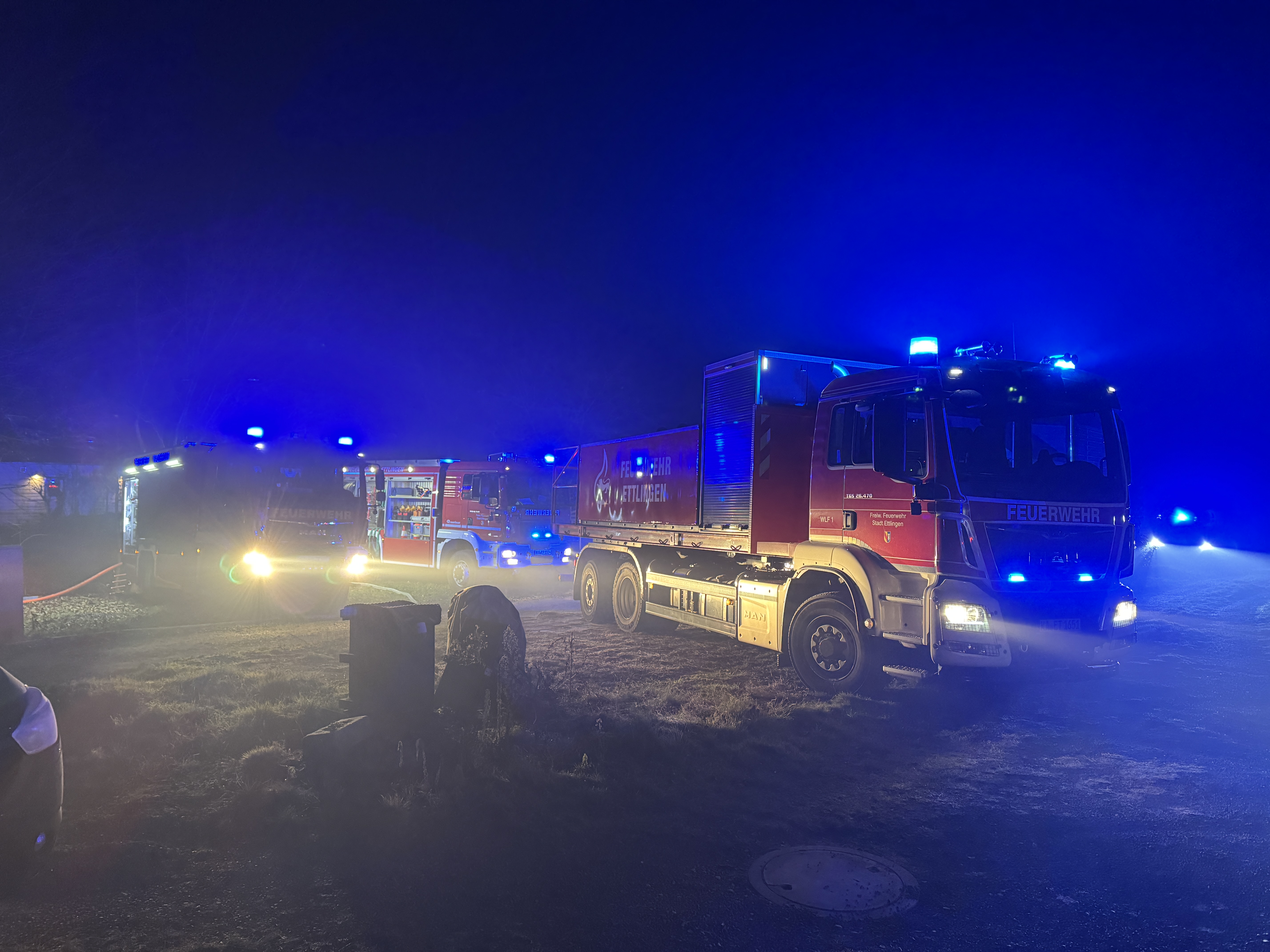 Dort kam es zu einem Brand mehrerer Wohnwagen mit Anbauzelten. Aufgrund der unklaren Wasserversorgung unterstützte die Feuerwehr Ettlingen hier zunächst mit dem Tanklöschfahrzeug sowie dem Abrollbehälter Tank mit insgesamt 14000 Litern Löschwasser. Im weiteren Einsatzverlauf wurde der Abrollbehälter Atemschutz mit dem GW Transport zur Einsatzstelle nachgefordert. Dieser Einsatz forderte die Feuerwehrkräfte bis in die frühen Morgenstunden.